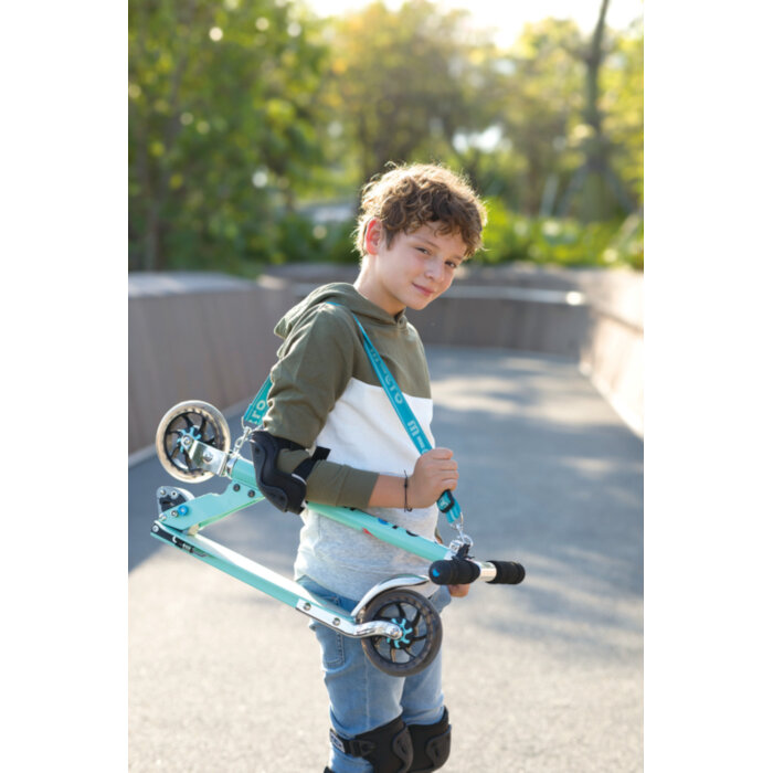 Ta pametno zasnovan ramenski trak se enostavno in hitro pritrdi na skiro. Omogoča vam, da skiro obesite čez ramo ali na ročaj otroškega vozička. Trak z vtkanim micro logom in kvalitetnimi zaponkami vam bo olajšal vsakdan. Med uporabo skiroja lahko ostane nameščen na krmilu. Odsevni logotip na traku črne barve še poveča vidnost in varnost.