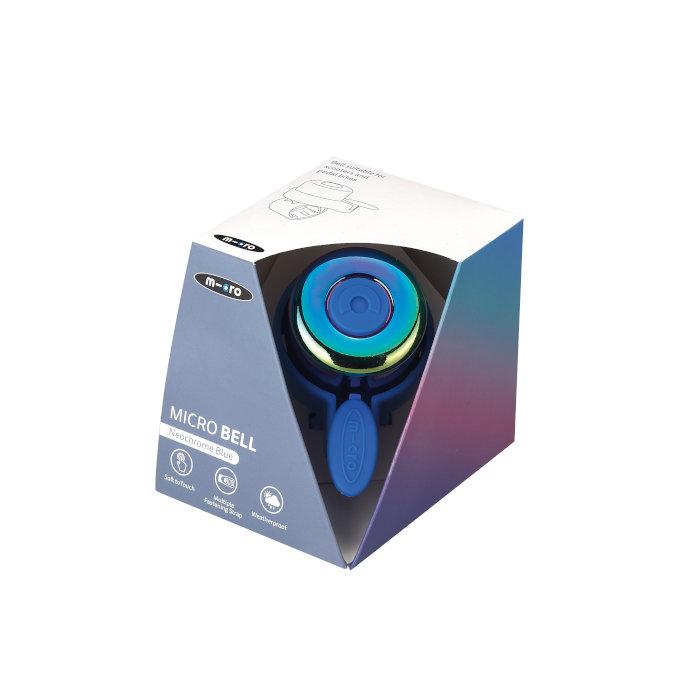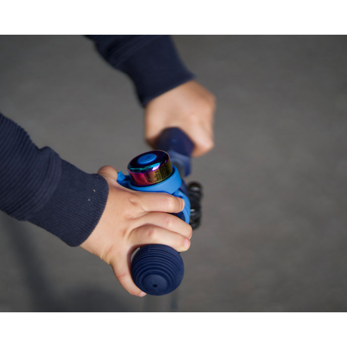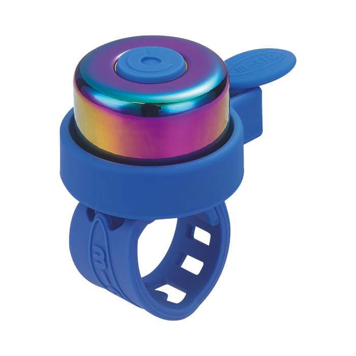 Simpatični Micro zvonček, ki se zahvaljujoč prilagodljivemu silikonskemu trakcu lahko uporablja na skiroju, poganjalcu ali kolesu.